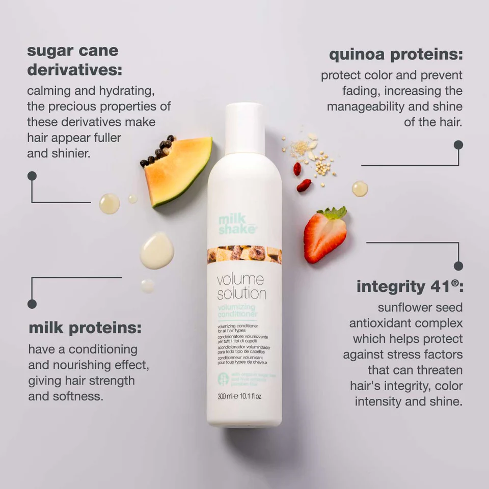 Transform flat or fine hair into full-bodied style with milk_shake volumizing conditioner. These hair styling products for volume promote long-lasting lift & fullness. This conditioner replenishes strands from roots to ends to keep hair looking full and voluminous. for even more volume, cleanse first with volumizing shampoo.