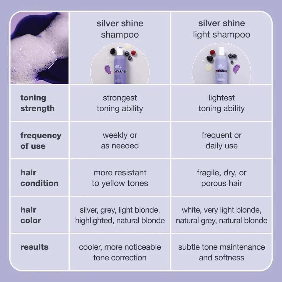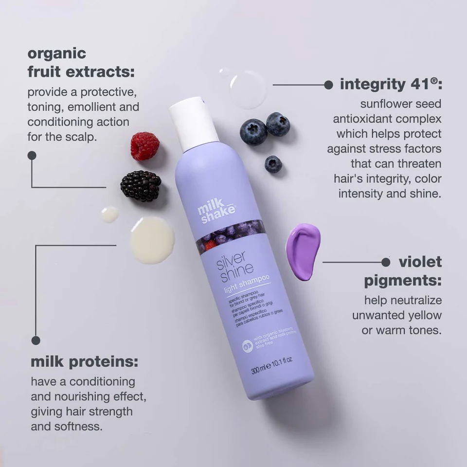 It is a delicate hair cleanser that contains 50% less pigment than the original shampoo for more moderate pigmentation. Helps neutralize unwanted yellow or brassy tones moderately.combines the benefits of purple pigment, organic berry extracts, milk proteins and Integrity 41® to maintain blond, grey or white hair color. The reduced percentage of violet pigment compared to the original milk_shake silver shine shampoo, makes milk_shake silver shine light shampoo neutralize unwanted yellow or brassy tones moderately: ideal for those people who want a balanced, cool blond. For best results combine with milk_shake silver shine conditioner and/or milk_shake silver shine whipped cream. SLES free. The fragrance in the silver shine range is a gorgeous gourmand experience: the head notes of blueberry, blackberry and raspberry blend with floral heart notes. The base notes are made of sweet musky tones that leave a delicate fragrance on the hair. for more moderate pigmentation. SLES free.